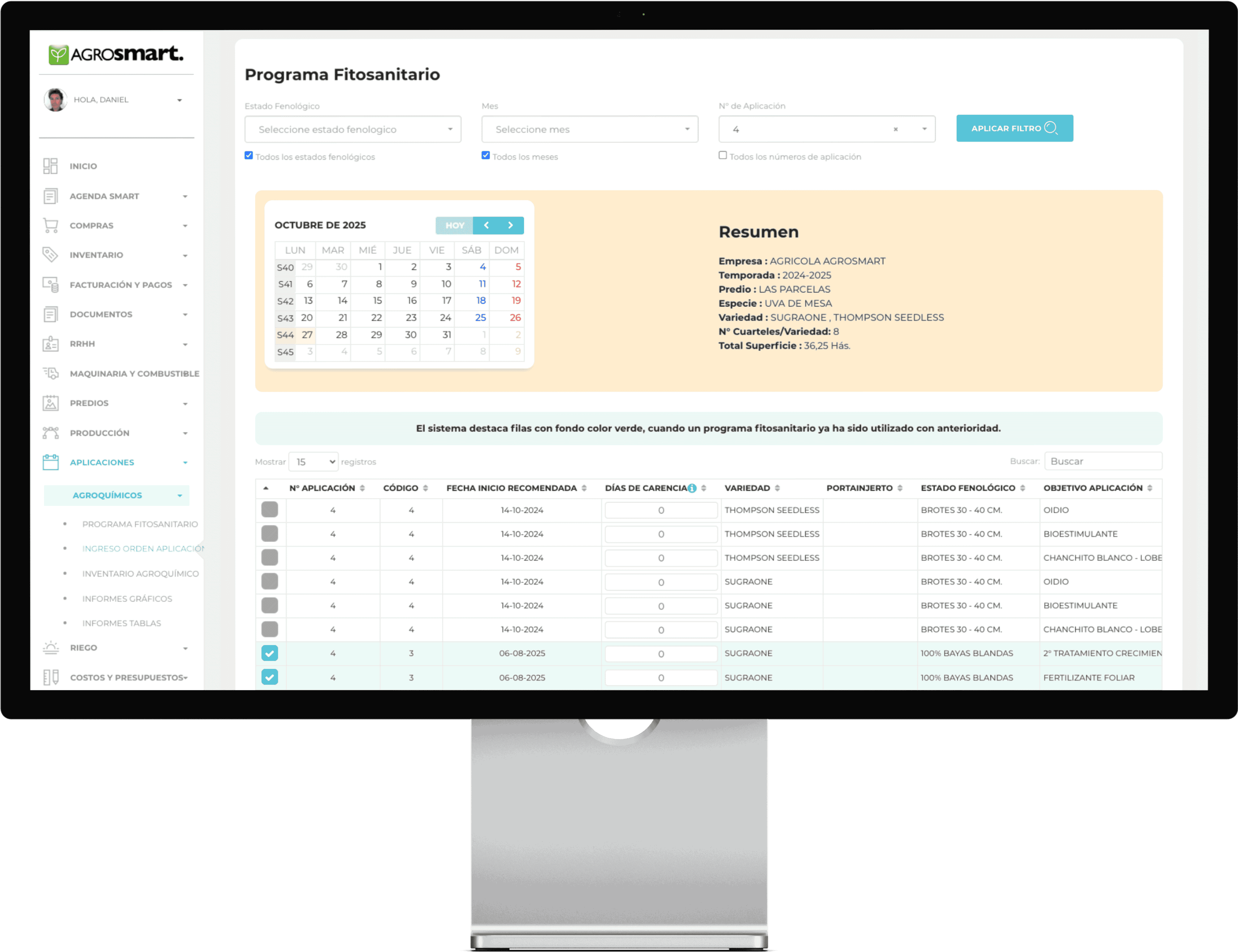 🌱 Al mismo tiempo costea la aplicación, prorrateando el costo por cuartel, comparando con lo presupuestado.