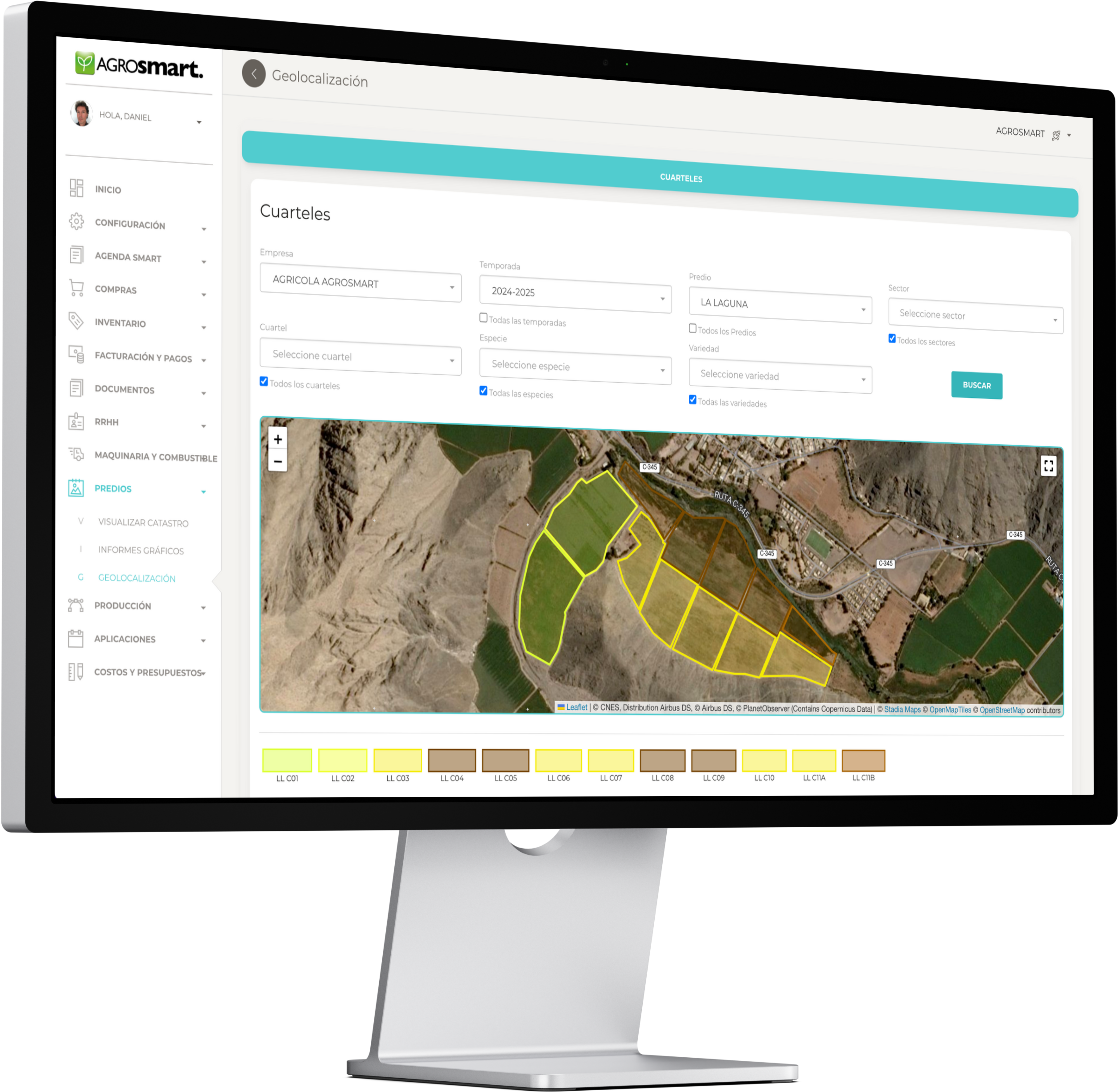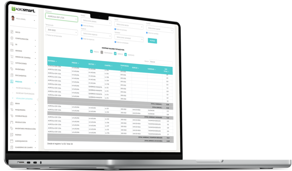 En AGROsmart, el catastro agrícola es el eje central, que te permite interactuar constantemente con el. El catastro agrícola en AGROsmart, no es solo un dato estadístico, es la herramienta que te permite registrar cada labor o faena a nivel de cuartel, imputando cada costo o gasto prorrateado a nivel de predio, sector y cuartel..