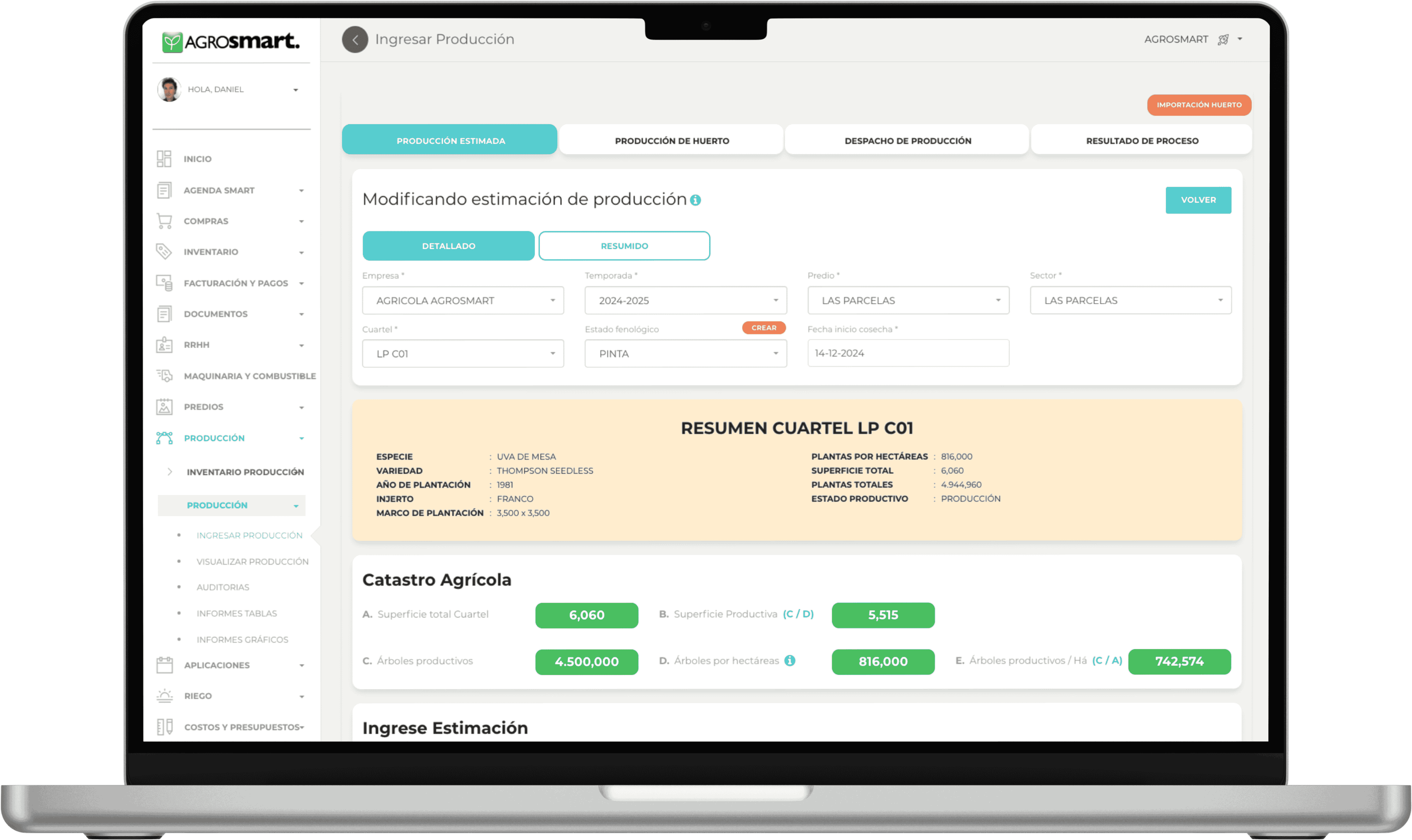 📉 Registra y revisa producción total estimada en kilos por cada cuartel.