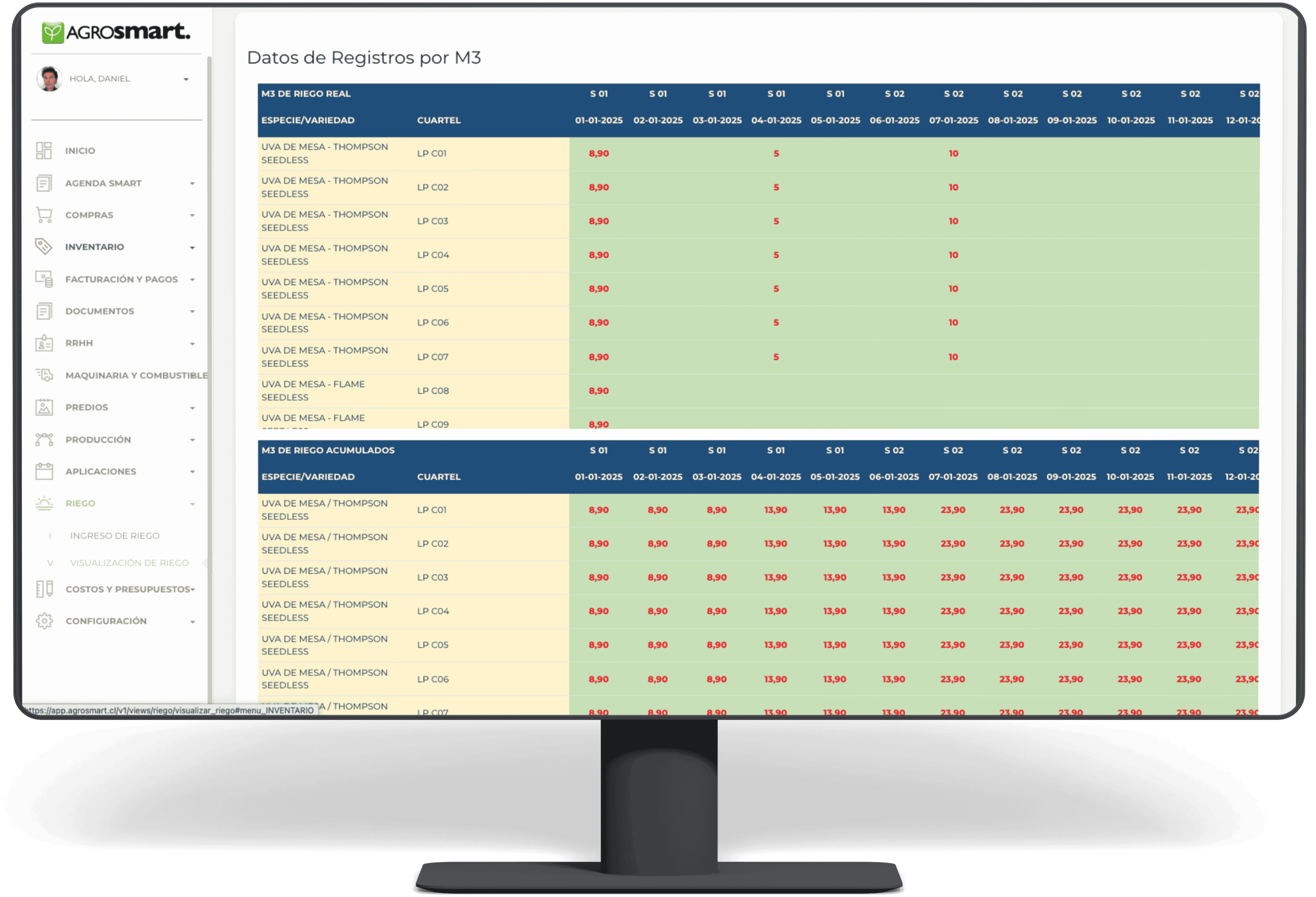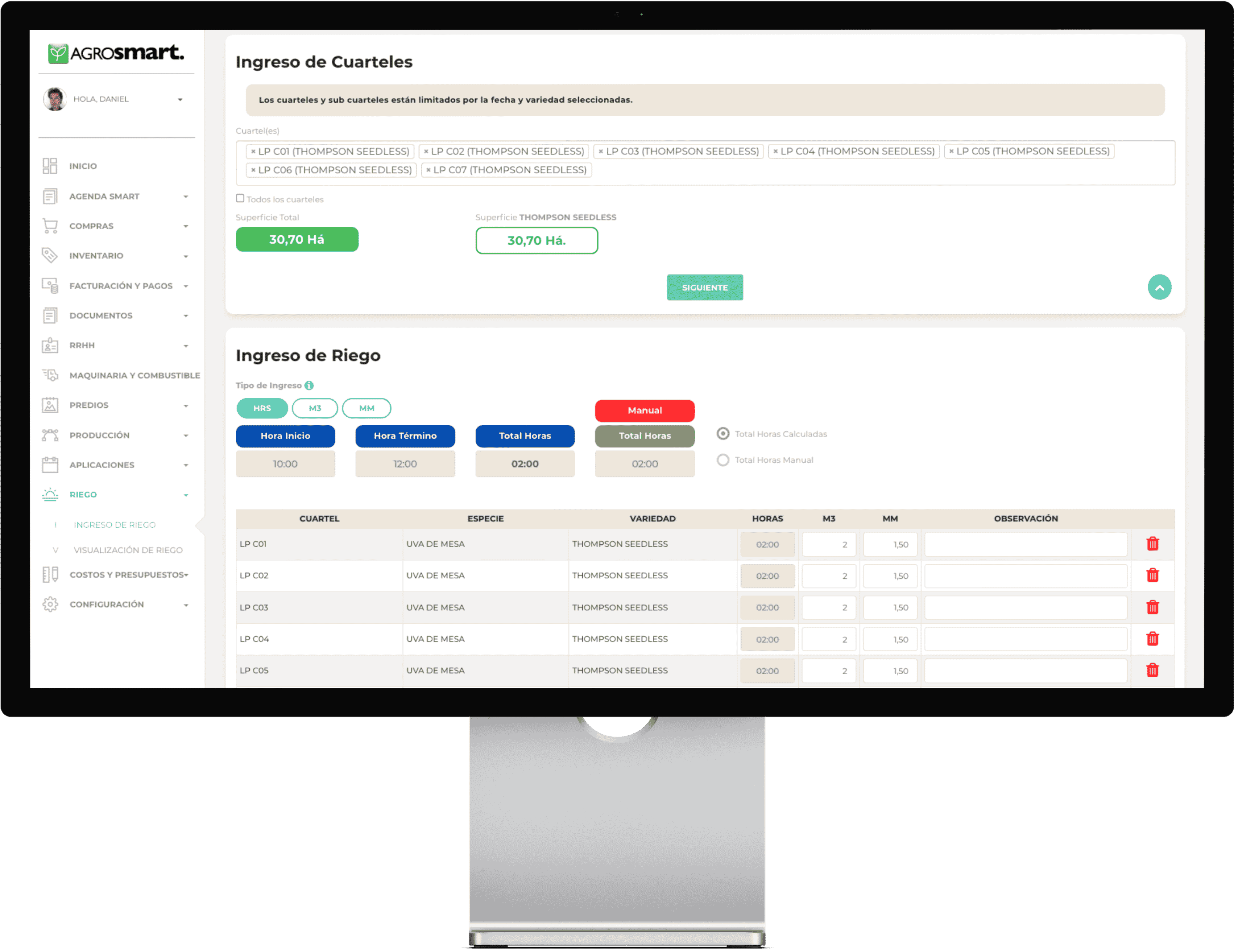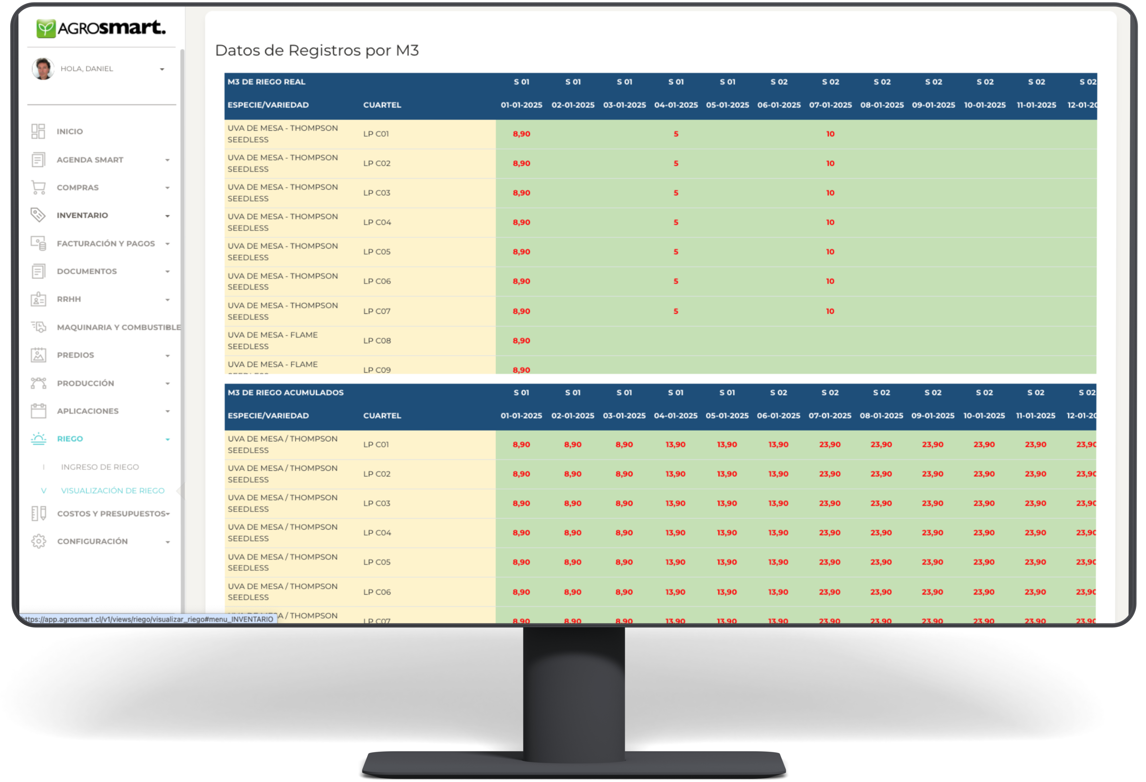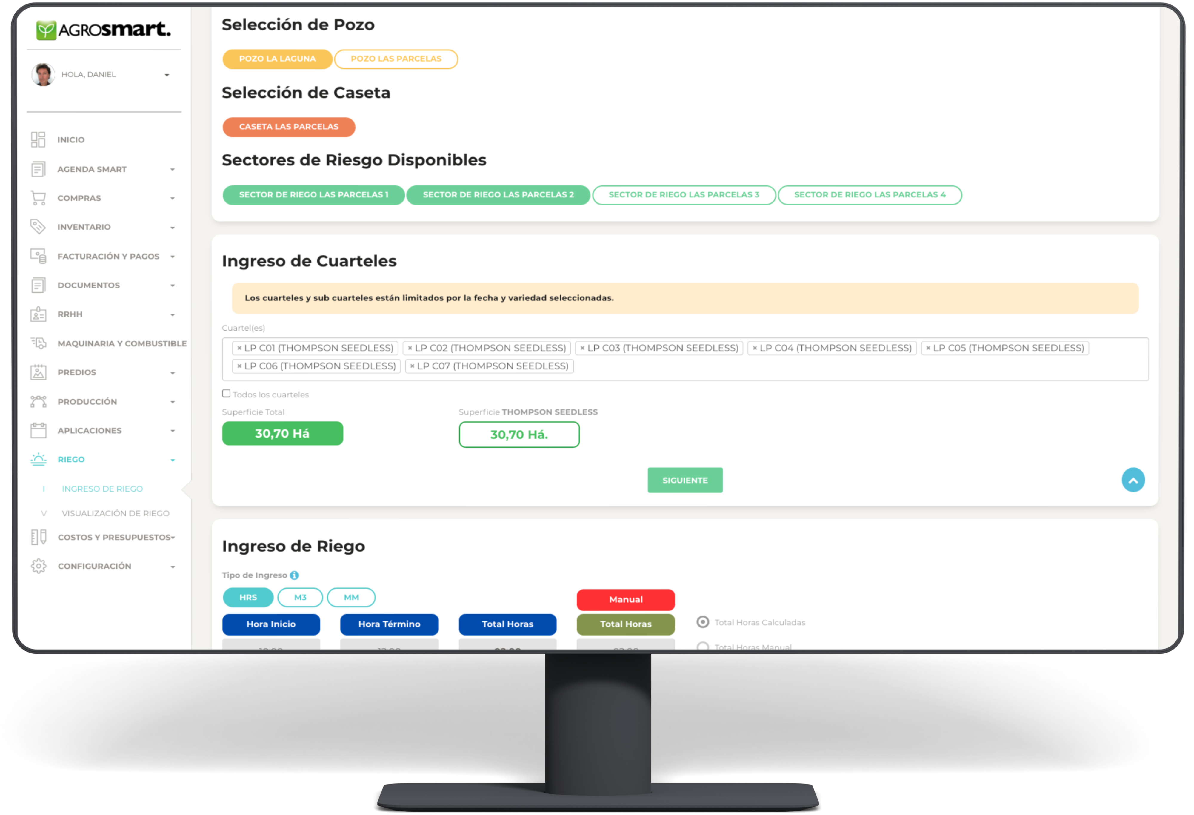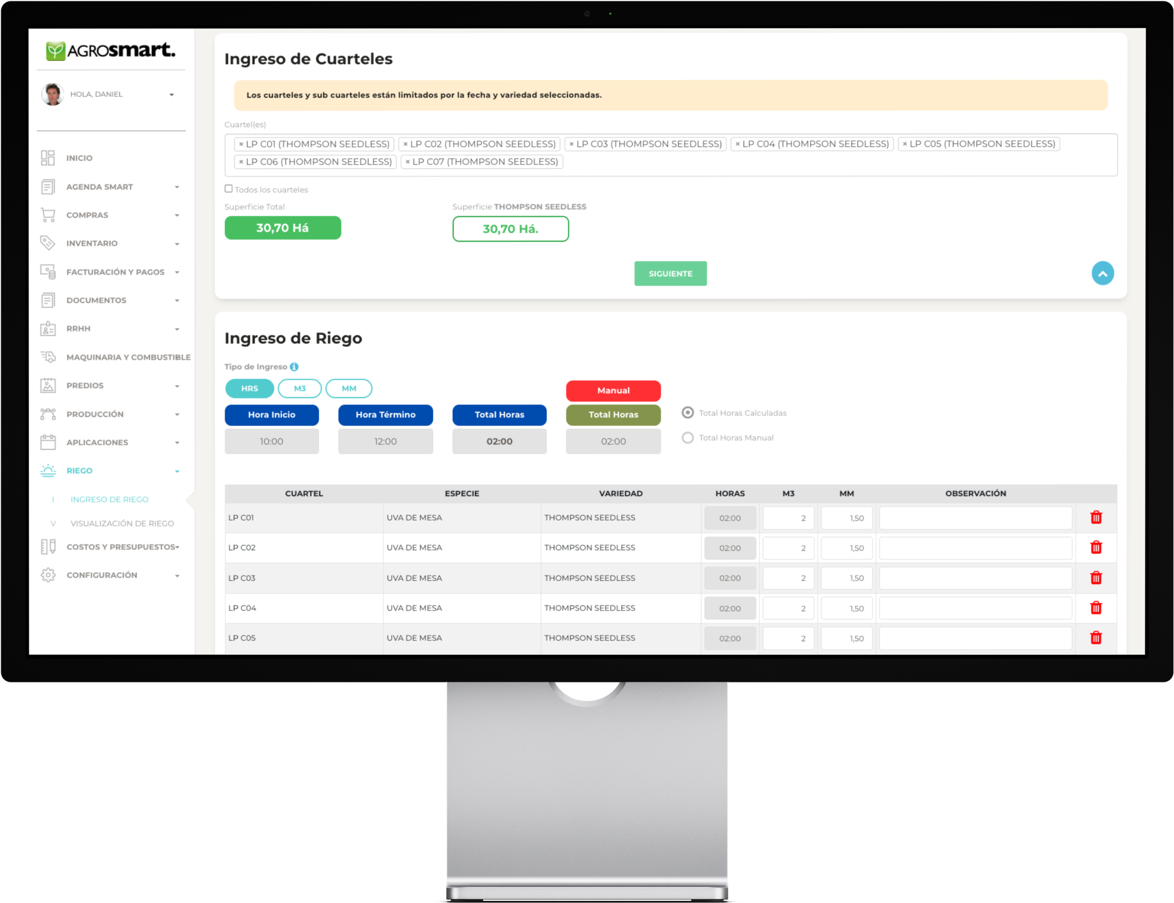 AGROsmart automatiza los cálculos de precipitación y caudal gracias a la configuración técnica del sistema: marco de plantación, líneas de goteros y litros por hora. Incluso controla el caudalímetro, asegurando un monitoreo confiable y continuo.