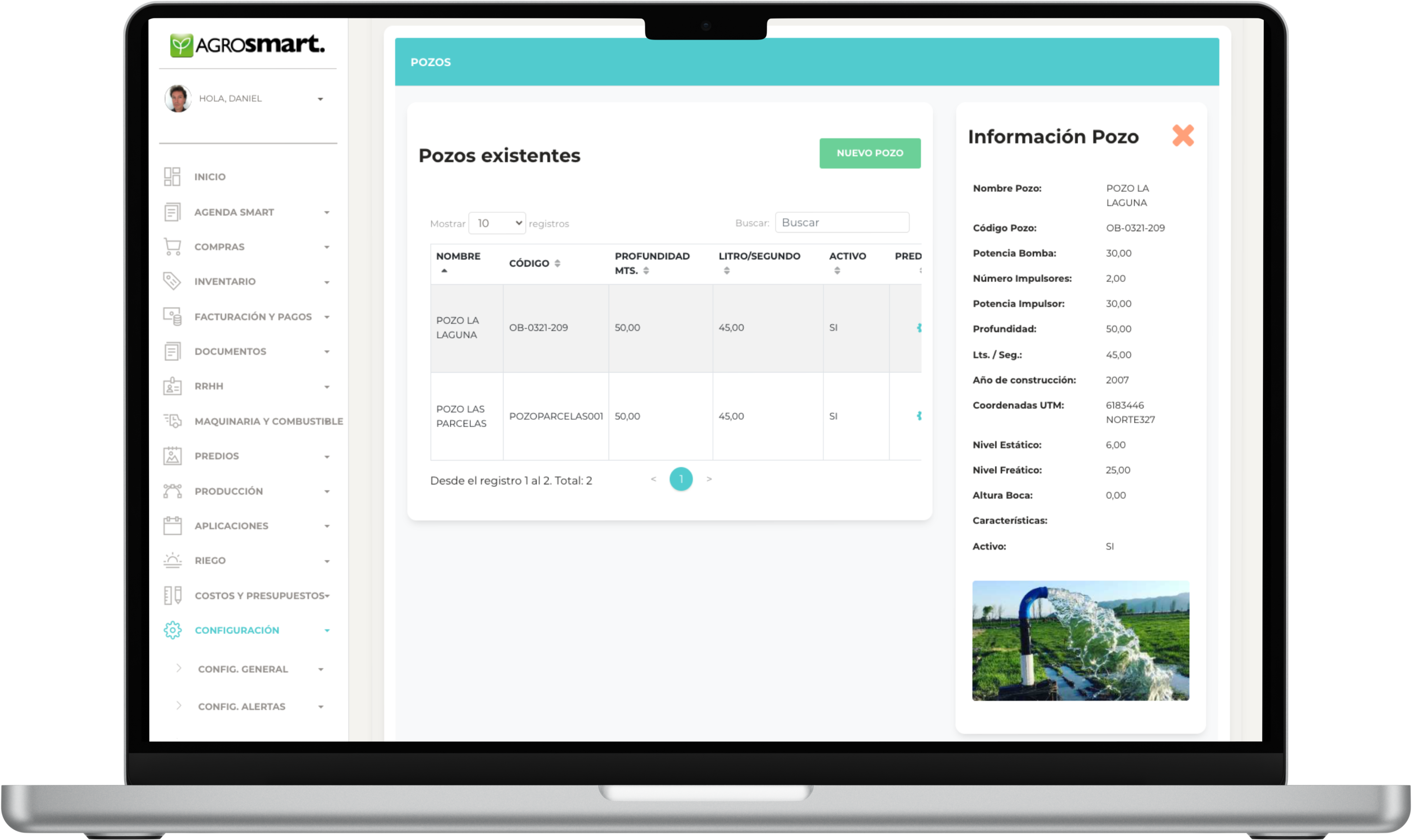 Define tus pozos, casetas, sectores de riego, predios y cuarteles directamente en la plataforma. AGROsmart refleja la estructura de tu sistema de riego tal como existe en terreno, facilitando una gestión personalizada y precisa.